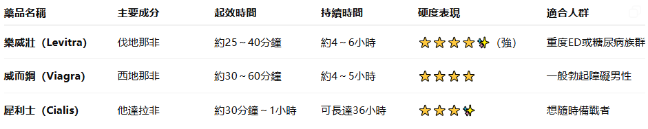 因此,樂威壯的核心功效就是提升勃起硬度與持久力,特別適合中度至重度勃起功能障礙(ED)患者。