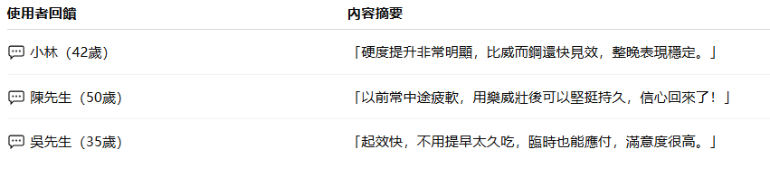雖然樂威壯並非早洩治療藥,但由於硬度穩定、控制力提升,不少使用者回饋「持久度自然變長」。