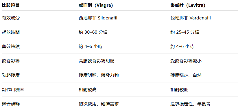 在治療男性勃起功能障礙(ED)的藥物中,威而鋼(Viagra) 與 樂威壯(Levitra) 是最具代表性的兩大品牌。兩者同屬 PDE5 抑制劑,但在成分、起效時間、飲食影響與副作用表現上仍存在明顯差異。