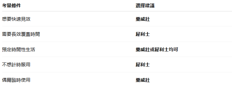 結論:樂威壯起效更快,適合即時需求;犀利士則因藥效起始時間略長但不差。